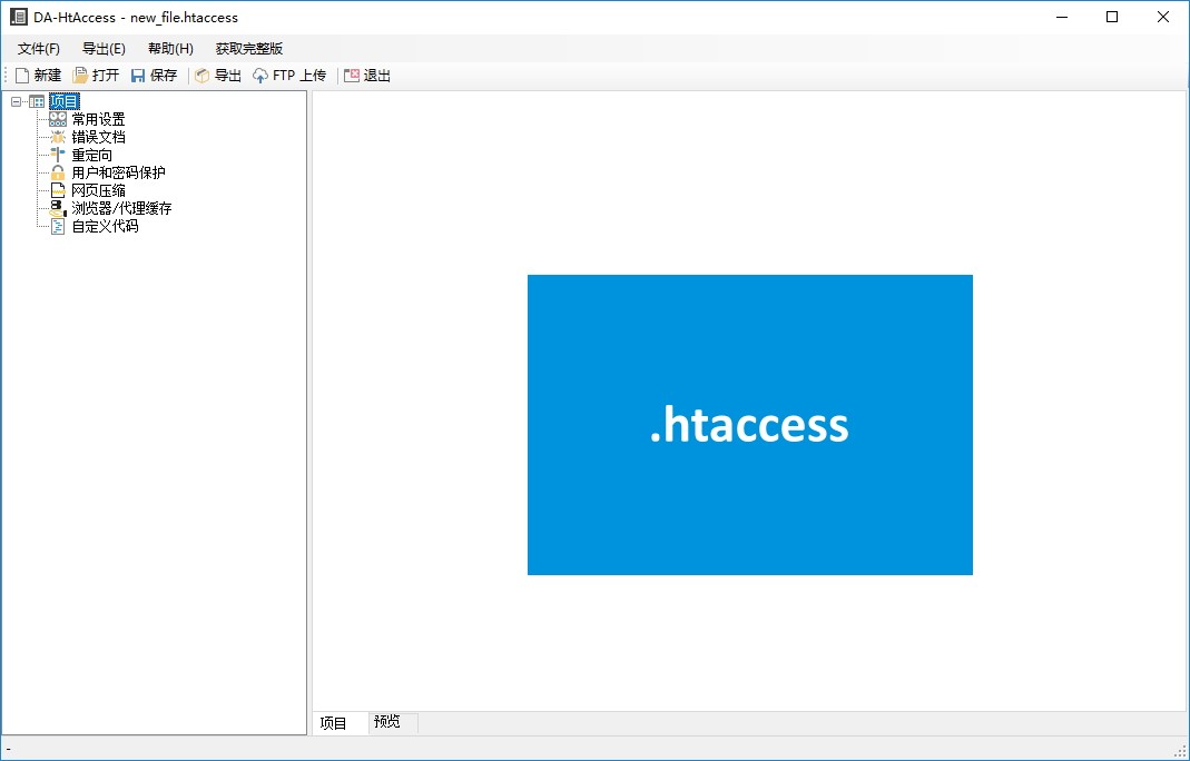 DA-HtAccess是一款功能强大、简单专业的服务器Htaccess创建工具,是一款可以为Apache Web服务器创建.htaccess 配置文件的软件,该软件集成导出以及FTP上传功能,可以将.htaccess文件直接导出软件或者上传到您的网站空间,可以说是网站建设的必备神器;DA-HtAccess这款服务器创建以及网站配置软件内置有常用设置、错误文档、重定向、用户和密码保护、网页压缩、浏览器代理缓存、自定义代码等多种功能操作模块,可以帮助用户快速便捷的进行网站服务器创建和文件配置,非常方便实用。
