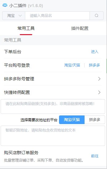 5、软件拥有小二常用工具,您可以通过常用工具进入下单后台,管理电商账号以及配置快捷转佣设置等。