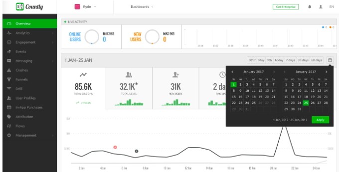 Countly的仪表板提供了快速分析,并让您瞥见了您的应用程序的性能。对于打算立即了解正在发生的事情的营销人员而言,它最有用。