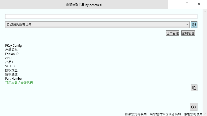 密钥检测工具是一个简单安全的程序密钥检测工具,它能够帮助用户快速从计算机中查找程序的密钥信息以及证书信息;这款软件除了拥有检测密钥信息的能力,还具备证书管理和密钥管理功能,让用户轻松的完成密钥检测和管理;这款软件可以查询多种Windows产品的密钥信息,包括Windows 10 CSVLK,Windows 8.1,Office 2019/365等等;密钥检测工具能够在用户重新安装以上软件的时候提供很大的帮助,通过该工具找回之前购买的软件密钥,用户就不用重复购买这些软件了。
