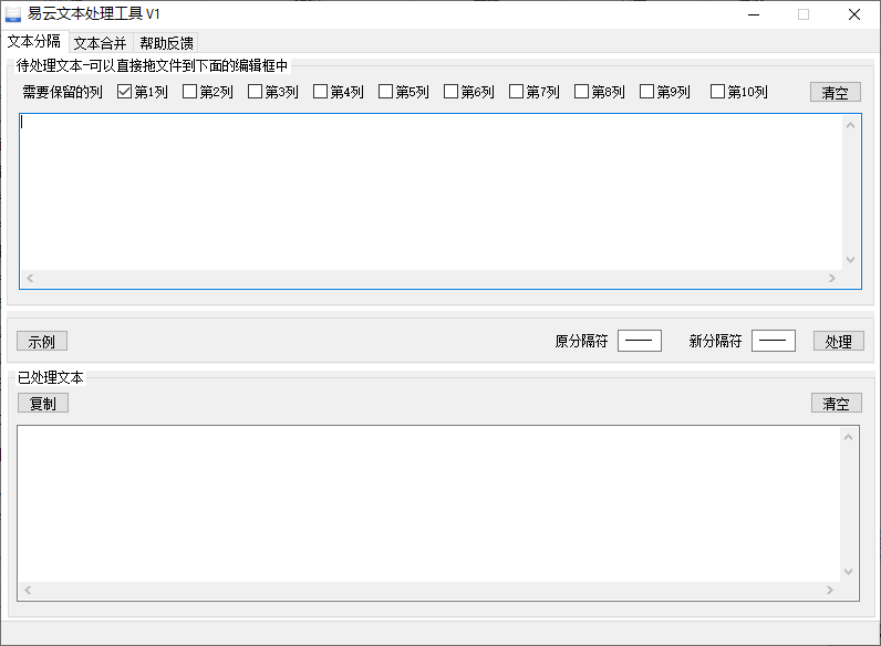易云文本处理工具是一个高效的文本合并和分隔符替换软件,使用这款软件可以帮助用户快速的替换文本中的分隔符以及将两个文本进行合并;有时候我们在处理文本时,可能会需要将半角符号替换成全角符号,使用手动方式进行修改不仅非常耗费时间,并且在修改的过程中还容易出现错误;易云文本处理工具是一个免费并且很简单的分割符修改工具,用户直接将需要修改的文本拖放到软件中即可设置替换符号进行修改,完成修改之后还可以一键将处理的内容复制到粘贴板中,十分的高效,需要的朋友欢迎下载使用。