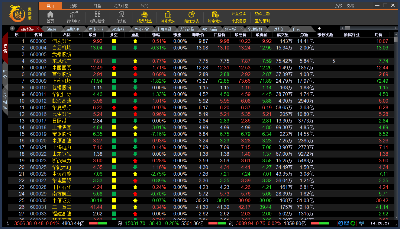 3、可以查看股市行情,板块指数,自选股,强龙战法,领张龙头,绩优龙头,资金龙头等股票信息。