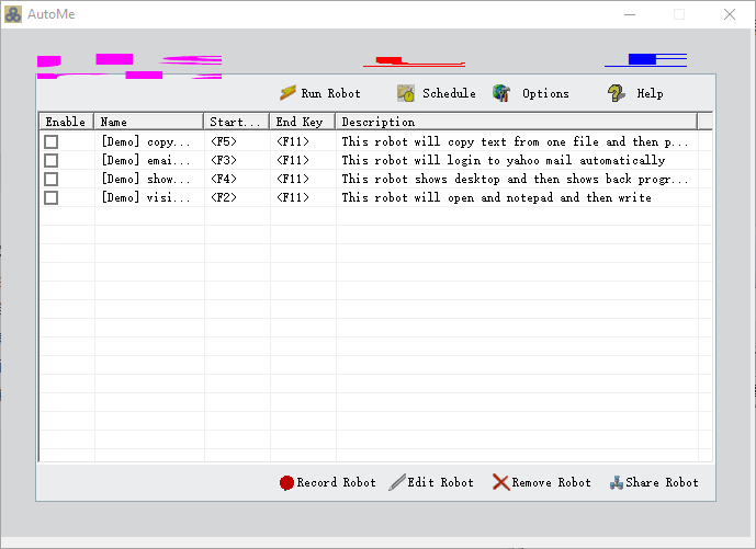 AutoMe是一款很便捷的自动化任务创建工具,这款工具可以帮助用户创建自动录入文本,自动点击,自动在线游戏以及自动刷新网站等功能;使用这款软件不需要用户用户用户拥有编程技术,这款软件本身就已经包含了四种自动机器人,用户可以直接选择运行;当然每一个用户所需要实现的功能是不一样的,因此AutoMe还提供了机器人的编辑功能,用户可以根据自己想实现的需要选择机器人进行编辑,让软件按照用户的设置进行自动任务;这款软件简单安全,需要的朋友可以下载体验。