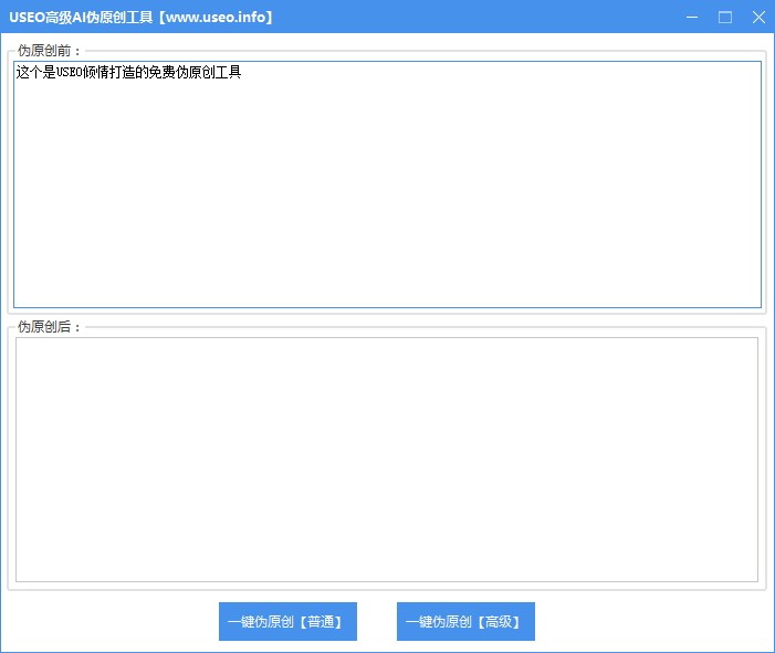 USEO高级AI伪原创工具是一款功能强大、简单易用的文章伪原创软件,该软件绿色安全、完全免费,无需安装下载即用,使用这款软件可以帮助用户进行内容智能伪原创,是一款网站站长或者文案编辑在职人员必备的文章伪原创必备工具;USEO高级AI伪原创工具内置有普通一键伪原创与高级一键伪原创两个文章伪原创操作功能,使用这款高级智能伪原创软件用户只需将文字复制粘贴到软件上然后点击一键伪原创按钮即可进行文本伪原创操作,让用户可以进行更轻松便捷、更快速高效的文章伪原创,有需要的用户可以下载。