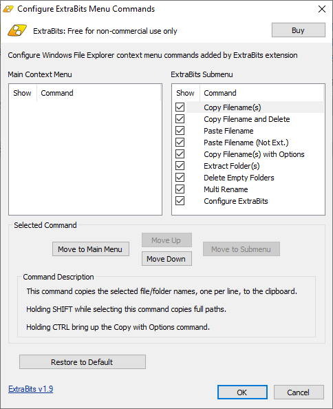 使您可以配置显示哪些ExtraBits命令,以及它们是否显示在ExtraBits子菜单或主上下文菜单中。这使您可以隐藏从未使用过的命令,以避免菜单混乱。
