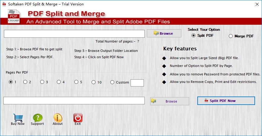 Softaken PDF Split Merge是一款简单专业的pdf文件拆分合并软件,使用这款软件用户可以分割各种大PDF文件,可以将PDF文件拆分为多个PDF页面,同时还可以从受保护的PDF文件中删除密码,可以解除PDF文件中各种权限限制,例如禁止打印、复制等;Softaken PDF Split Merge还支持PDF文件合并功能,可以将多个PDF文件合并为一个,通过该软件用户可以实现对PDF文件拆分合并的处理工作,用户只需导入需要拆分或者合并的PDF文件即可对其进行简单专业的PDF文件分割合并,有需要的用户可以下载进行使用。