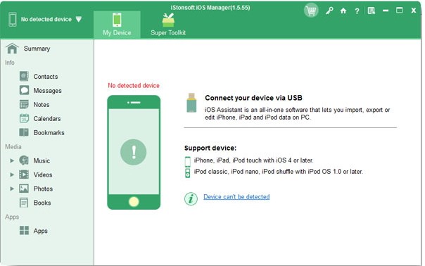 作为iPhone,iPad和iPod的最佳伴侣,iStonsoft iOS管理器已在Super Toolkit(超级工具包)区域中添加了各种有用的功能。将设备连接到计算机后,您可以直接输入“超级工具包”类别。然后,选择所需的功能并开始对其进行管理。