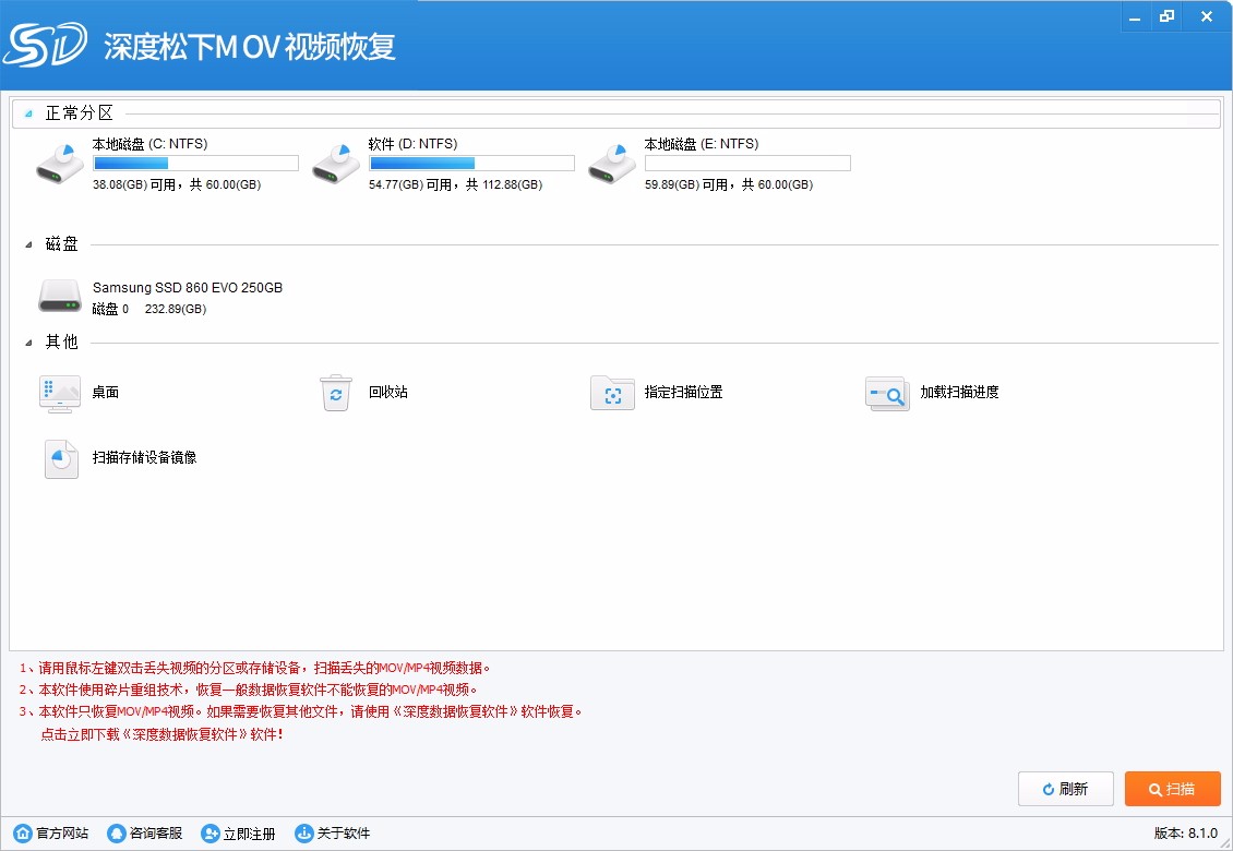 深度松下Mov视频恢复软件是一款非常专业且优秀的松下MOV视频恢复软件,专门用于恢复松下相机、摄像机拍摄的MOV格式视频数据,通过这款软件,可帮助用户快速将松下设备上丢失的MOV视频文件进行恢复,软件界面简洁直观,结构清晰明了,使得软件操作也变得非常简单,只需选择丢失MOV视频文件所在磁盘,对该磁盘进行扫描,选择需要恢复的文件,一键即可进行恢复,使用起来非常方便,且软件恢复速度快,运行稳定,总之这是一款非常好用的软件,如果您有需要,那就赶快下载体验一下吧!