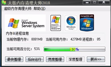 太极内存清理大师是一款非常简单且实用的内存清理软件,顾名思义,通过这款软件,可帮助用户快速将电脑内存进行清理,软件界面简洁直观,结构清晰明了,使得软件操作也变得非常简单,使用该软件,可帮助您在不会伤害硬盘的情况下,快速清理内存,即便您是新手,也能在短时间内快速掌握具体的操作方法,软件支持不同的清理方式,包括最快整理、宽度整理和深度整理,您还可以设置自动清理时间,在指定时间自动清理电脑内存,总之这是一款非常好用的软件,如果您有需要,那就赶快下载体验一下吧!
