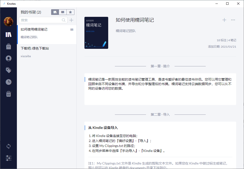 糯词笔记是一款全能的笔记管理软件,具备笔记编辑,书籍创作,书籍注释,阅读书籍等等功能,能够帮助习惯电子阅读的朋友更好的管理自己的书籍;软件允许用户从Kindle,My Clippings.txt以及微信读书等阅读平台中添加书籍进行阅读,它为用户提供了丰富的书籍管理功能,用户可以对书籍进行收藏,添加标签,修改书籍信息等;您还可以使用糯词笔记回顾您喜欢的书籍,整理书籍的知识点,提升自己的阅读能力;这款软件支持云端同步,您可以将电脑上的内容同步到手机上,在任何地方都可以阅读您的书籍和编辑笔记。