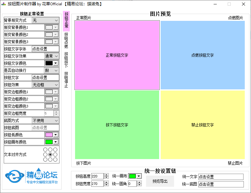 按钮图片制作器是一款用来自定义图片按钮的工具,在网页设计或者是程序开发时,这款工具可以帮助我们制作出比较有特色的按钮;这款工具比较灵活好用,有四种按钮类型可以选择,并且用户针对不同的按钮可以进行个性化的设置,按钮的效果完全由用户自己掌控,非常简单;按钮图片制作器还为用户提供了预览功能,用户可以在完成制作后查看按钮的运行效果,满意之后在将其导出保存;用户可以在按钮中添加文字,更换按钮的底图颜色等等,感兴趣的用户赶紧下载体验吧。