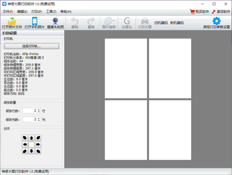 神奇大图打印软件是一款很简单的大图打印工具,这款工具与一般的打印工具不同的地方在于,这款软件是专业用来打印大图的,比如海报,拼接图板和广告等等;这款工具可以平均的将图像分为多张页面进行打印,用户可以自定义设置打印的纸张,灵活的调整图像打印参数;神奇大图打印软件极具性价比,这款工具是试用版本,用户可以免费体验,如果需要购买也只需要十八元就可以获得软件的永久授权码,并且每一个授权码可以用于五台电脑;需要的朋友欢迎下载使用。