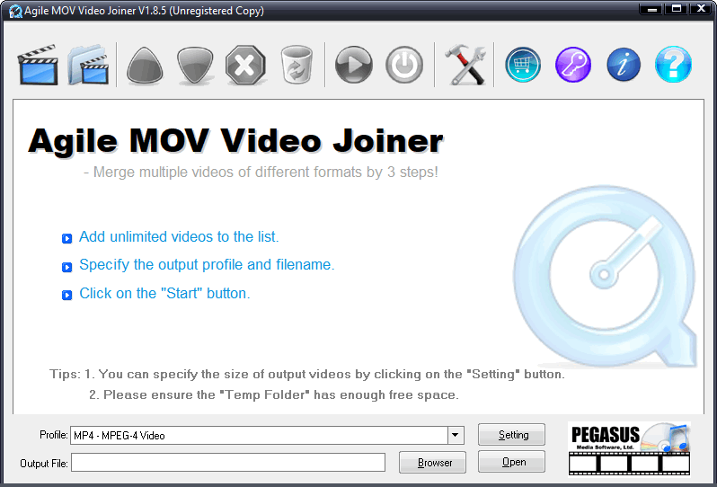 Agile MOV Video Joiner是一款的很简单的视频合并软件,它可以帮助用户将主流的视频合并为一个完整的视频,支持混合合并,比如分别将AVI,MPEG,MP4等格式的视频进行合并输出;制作视频的时候首先是需要找视频素材,素材找到之后就是将这些素材合并起来,而Agile MOV Video Joiner所起的作用就是合并视频;这款工具相当简单,没有任何的使用障碍,尽管不是中文界面,用户也可以通过软件图标知道软件是如何操作的;软件可以将合并的视频以一个指定的视频格式导出,以确保合并的视频可以在指定的播放器上打开并播放。