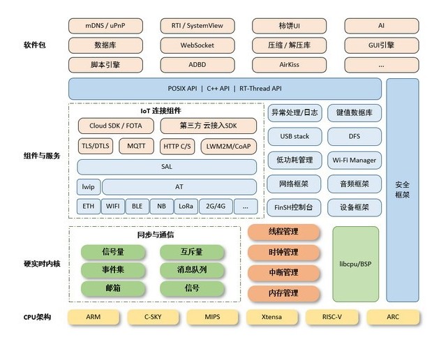 内核层:RT-Thread 内核,是 RT-Thread 的核心部分,包括了内核系统中对象的实现,例如多线程及其调度、信号量、邮箱、消息队列、内存管理、定时器等;libcpu/BSP(芯片移植相关文件 / 板级支持包)与硬件密切相关,由外设驱动和 CPU 移植构成。