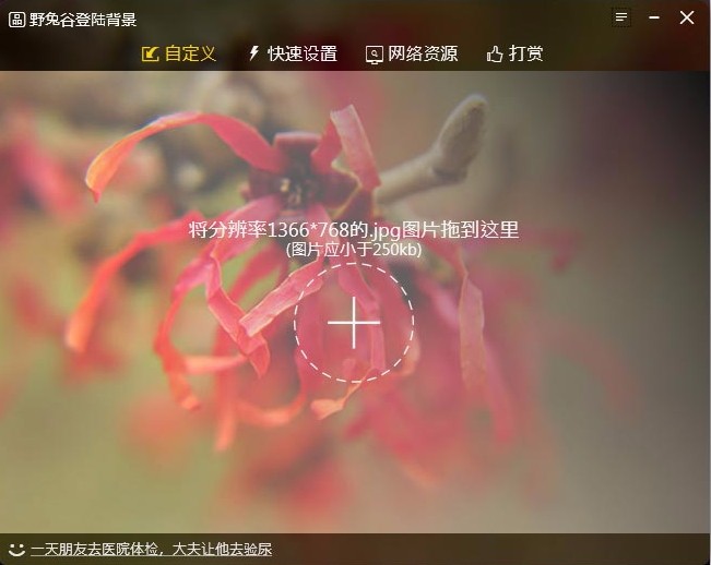 怎么快速修改windows默认登陆背景,野兔谷登陆背景是由野兔谷软件推出的windows系统美化工具,它支持快速设置windows的登陆背景,让你的电脑进入系统前不再是单调的默认背景。还可以方便的管理现有背景资源图片。免费的工具,省心还省力,可以让您的电脑变得更加漂亮。快速设置,简单管理,操作方便,只要把合适的漂亮图片拖到软件就完成设置。软件界面本身有多种背景可选,不会单调乏味。背景资源管理功能让图片变得井井有序。