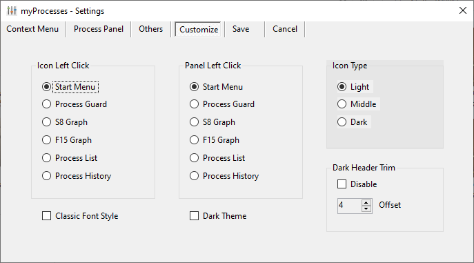 3、在设置面板中分别有上下文菜单、“进程”面板、“其他”、“自定义”、“保存”等设置方案。