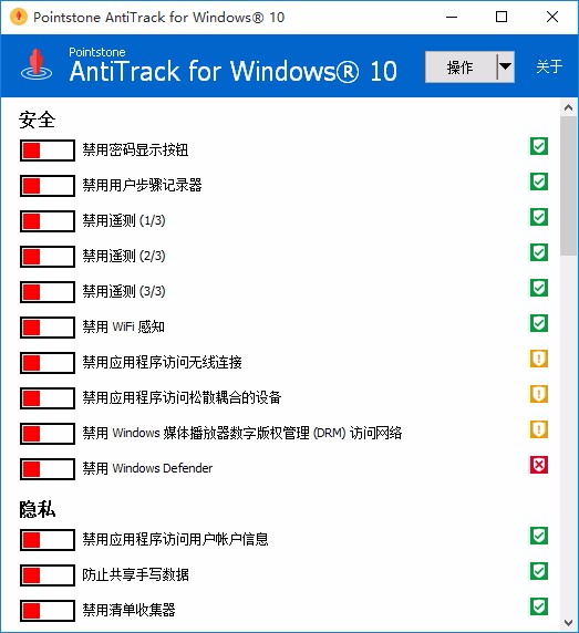 10是一款非常简单且实用的隐私关闭保护工具,适用于Windows10操作系统,使用该软件,可帮助您轻松保护自己的电脑内的隐私不会被盗窃,有效确保数据安全,提升系统的安全性,软件简洁易用,与其它相关软件相比,大幅简化了许多繁琐的设置,同时也省去了很多复杂的操作,软件为每个隐私设置提供了相应的建议,打钩的表示建议使用这些设置,对于打叉的设置,即这些设置不建议使用,总之这是一款非常好用的软件,如果您有需要,那就赶快下载体验一下吧!