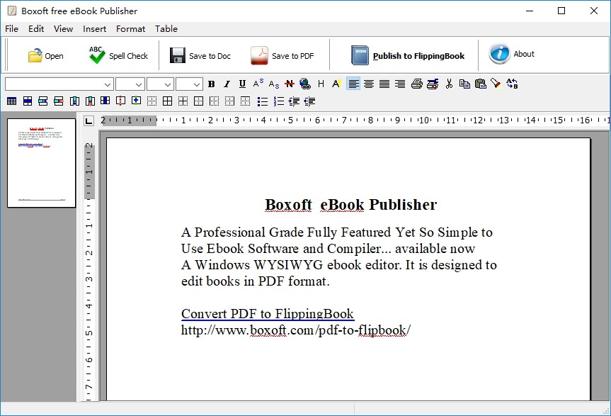 Boxoft eBook Publisher是一款功能强大、简单易用的电子书输出软件,使用这款软件用户可以轻松创建Doc文件以及PDF文件,通过该软件用户可以对打开各种文本到软件上进行浏览编辑,可以将完成编辑的文本导出为Word文件或者PDF文件;Boxoft eBook Publisher电子书出版软件,顾名思义是一款可以进行电子书制作的软件,使用这款软件用户可以将添加到软件上的文本进行翻页电纸书制作,同时该软件还可以对制作数据的文本字体大小、颜色等进行编辑,可以对电纸书进行图像插入、连接添加、表格绘制等操作,非常方便实用。