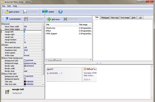 Boxoft JavaScript NewsTicker是一款功能非常强大且非常专业的新闻编辑软件,可以使用这款软件用户可以对网站的新闻滚动条等进行设计编辑,同时还可以根据需要更改模板方向、背景、大小以及滑动方式等进行设置编辑,通过这款JavaScript新闻行情编辑软件,用户可以在几分钟内创建DHTML新闻代码并立即查看结果,非常简单便捷;Boxoft JavaScript NewsTicker可以轻松地使用内容滑块、内容旋转器、横幅旋转器以及图像旋转器等多种功能,可以简单专业、快速便捷的设计新闻滚动器,是一款非常不错的可视化新闻编辑工具和预览软件。
