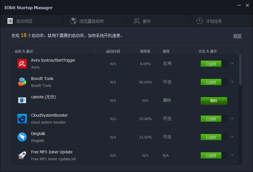 Manager是一款非常专业且优秀的启动管理器,通过这款软件,可帮助用户快速将其安装到Windows操作系统上进行开机优化限制管理自动启动,软件功能丰富,应有尽有,总有您需要使用的功能,包括启动项目、浏览器启动项、服务、计划任务,可对四个不同的项目进行管理,从多方面满足您对启动管理的不同需求,每个功能对应的操作都非常简单,只需选择不需要的项目,一键即可进行禁用,总而言之这是一款非常好用的软件,如果您有需要,那就赶快下载体验一下吧!
