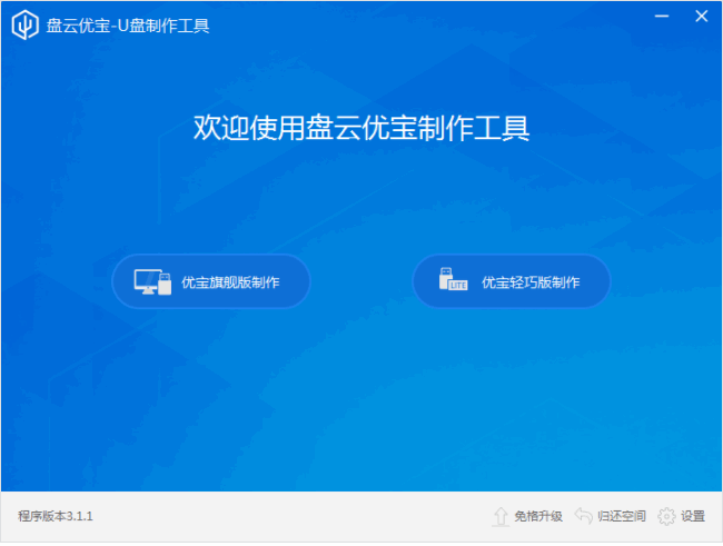 盘云优宝制作工具是一款用来制作系统PE的工具,这款工具简单好用,无经验的用户也可以使用它轻松制作系统安装盘;众所周知安装系统有两种方式,一种是通过U盘另一种是通过DVD,现在还有一种是在线安装,不过在线安装适用于电脑还可以正常使用的情况,如果系统已经奔溃导致无法正常使用,那么U盘和DVD的安装方式无疑是最佳的选择;随着不少电脑主机取消DVD驱动器,U盘更是成为了目前安装系统的唯一方式;不过使用U盘安装系统需要用户提前制作系统盘,而这款工具的作用就是帮助用户制作系统盘。