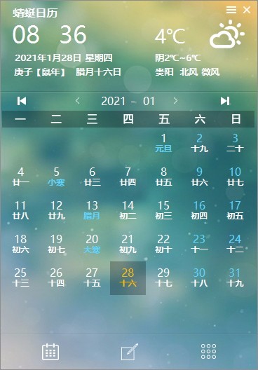 蜻蜓日历是一款非常简单且实用的桌面应用日历软件,通过这款软件,可帮助用户快速查看日历,在我们的日常工作和学习中,可能会经常需要查看日历,以便准确把握好时间,完成具体的事项,这时候就可以用到这款软件,该软件不仅能够查看不同年份不同月份的日历,同时还提供了日程管理和天气功能,可更加方便的管理自己的行程,还可查看当地的天气,自动进行定位,并自动显示该地的天气情况,做好出门准备,给我们的工作和学习带来了很大的便利,有效提高了工作和学习效率,这么好用的软件,赶快下载试试吧!