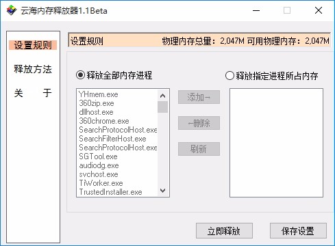 云海内存释放器是一款非常简单且实用的内存释放软件,顾名思义,通过这款软件,可帮助用户快速将软件内存进行释放,使用该软件,可帮助您轻松释放出其它应用软件在运行时没有及时释放的内存资源,能够有效保证系统运行流畅,不会出现卡顿的情况,软件界面简洁直观,操作也非常简单,只需设置释放规则,选择释放方法,一键即可释放软件内存,可一次性释放全部内存进程,也可释放指定进程的所占内存,使用起来非常方便,总之这是一款非常好用的软件,如果您有需要,那就赶快下载体验一下吧!