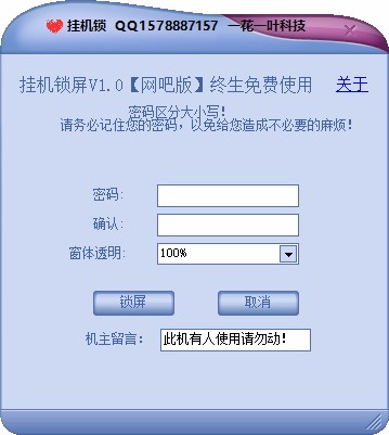一花一叶挂机锁是一款非常简单且实用的挂机锁屏软件,适用于网吧,通过这款软件,可帮助用户快速将电脑屏幕进行锁定并进行挂机,有的时候,在网吧上网时,需要暂时离开电脑购买商品或处理相关事情,不希望别人动自己的电脑,这时候就可以用到这款软件,可自行设置密码,密码设置好后,请务必记住您的密码,以免给您造成不必要的麻烦,一键即可进行锁屏,屏幕锁定后,需要输入正确的密码才可解锁屏幕,总之这是一款非常好用的软件,如果您有需要,那就赶快下载体验一下吧!