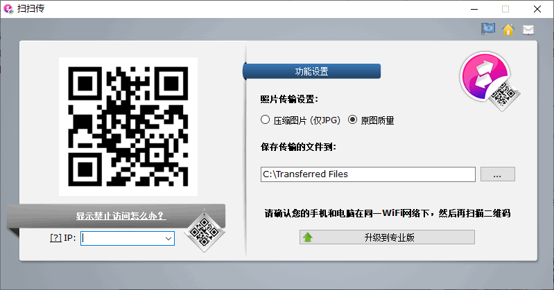 扫扫传是一款简单易用的文件传输工具,主要用来帮助用户将手机相片或者视频等上传到电脑中;这款工具仅支持单向传输,即用户可以从手机上传输文件到电脑上,而电脑无法将文件传输到手机中,这主要是因为这款工具传输文件的方式与其它文件传输工具不一样;大部分的文件传输工具都需要用户在分别在手机和电脑上安装一个传输软件,而扫扫传则只需要用户在电脑上安装软件就可以实现文件传输;用户可以使用带扫码功能的软件直接扫描软件生成的二维码就可以创建连接并传输文件;感兴趣的用户欢迎下载体验。