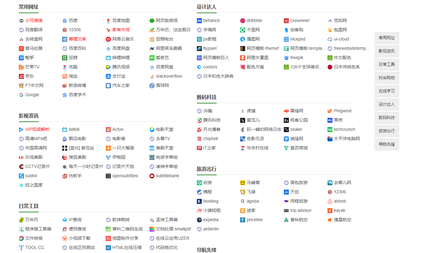 4、插件的导航分类有常用网址、影视资讯、日常工具、时尚购物、在线学习、设计达人、数码科技、旅游出行、导航先锋。