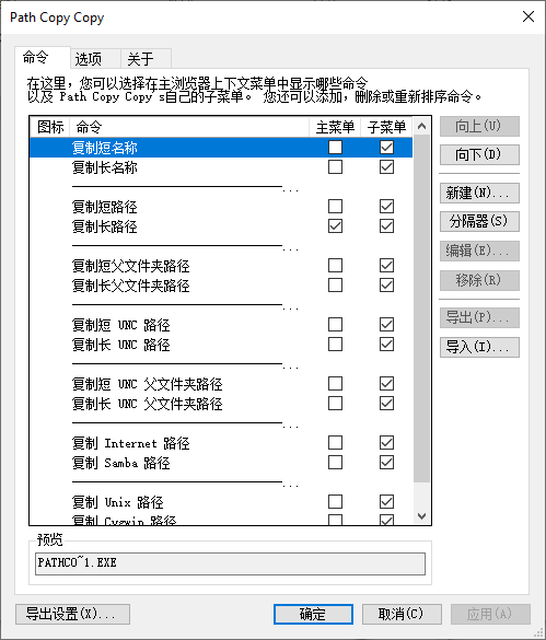 Path Copy Copy是一款强大的文件路径复制软件,这款工具非常灵活,用户可以使用它通过各种方式快速复制用户需要的路径;该工具支持用户自定义复制任务,并且将所有的文件或者文件夹添加到傻瓜下文菜单中,用户可以很快速的访问对应文件的路径和对其进行复制;Path Copy Copy中包含了很多功能,基本上可以满足不同用户的各种使用需求;软件中的自定义命令可以用来扩展Path Copy Copy的功能,用户可以使用现有的命令并且创建一个复制文件路径的新方法;需要的朋友欢迎下载使用。