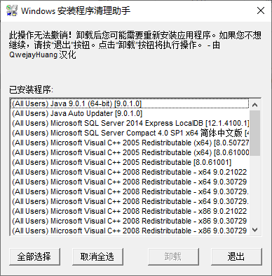 Windows安装程序清理助手是一款很轻小的程序卸载工具,该工具采用了一个极为简洁的用户界面,功能比较少,只有全选,取消全选和卸载三个功能;使用这款工具卸载程序的时候不需要用户手动添加程序,它会在启动之后自动获取系统程序,然后用户就可以浏览到所有可卸载的程序并选中卸载;Windows安装程序清理助手的大小仅有50KB,不会生成额外的数据文件,也不需要安装,需要使用的时候直接双击打开就可以,很方便;它支持批量卸载删除程序,可以节省用户不少的时间。