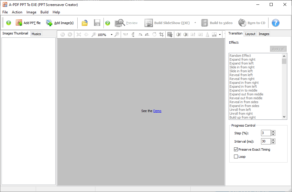 A-PDF PPT to EXE是一款功能强大且丰富的PPT转换工具,严格来说也不算是PPT转换器,而是使用PPT和图片作为素材重新制作幻灯片程序以及视频的这样一款软件;用户可以将自己的PPT文档转换成EXE文件或者是AVI视频文件,这样方便用户将其上传到网络中分享;A-PDF PPT to EXE预置了丰富的幻灯片处理特效,用户可以直接使用这些效果以让幻灯片在播放的时候更加吸引人;这款工具的使用方式较为简单,不需要复杂的设置,只需要添加图片,添加效果,然后输出保存即可,当然如果您想让您的幻灯片内容更丰富一些,那么您可以多花一些时间进行处理。