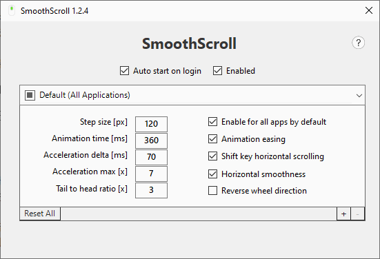 SmoothScroll是一款鼠标增强设置软件,主要是通过设置为鼠标增加一些功能,以让用户有一个更好的操作体验;每位用户对鼠标的使用体验都不一样,不过对于一般用户而言,基本上也可以将就使用;而对于喜欢玩竞技游戏的用户来说,鼠标更贴合自己的使用习惯会更好;SmoothScroll拥有很多鼠标增强选项,用户可以设置鼠标的跟手程度,顺滑度以及滚动效果等;让用户在使用鼠标执行一些操作的时候感受流畅的体验;用户还可以可以设置单独的程序增强功能,需要的朋友赶紧下载体验吧。
