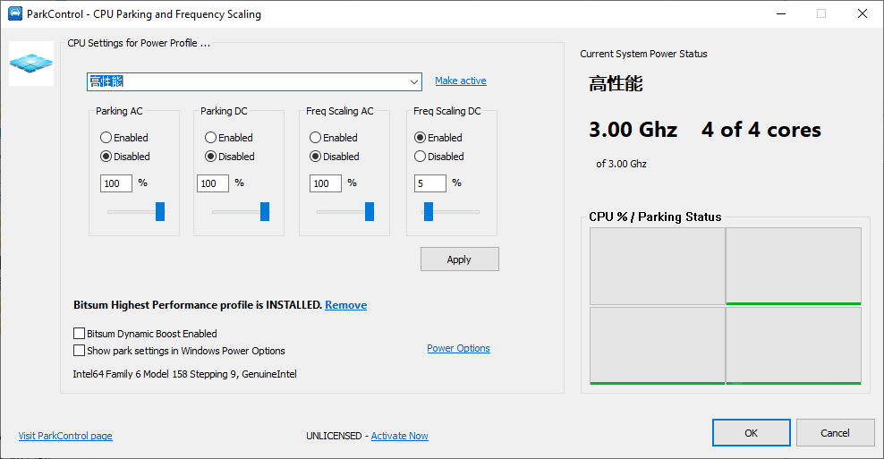 ParkControl是一款CPU性能调节软件,该软件包含四个CPU性能调节选项,分别是高性能,平衡,节能和Bitsum最高性能,其中高性能适合用户在处理一些大型任务的时候使用,它会将CPU的性能达到最高,如果还觉得够,您可以切换到Bitsum最高性能;而平衡性能适合我们平时使用,它不会过于限制CPU性能,也可以保证用户的正常使用;在不需要使用或者是执行一些不重要的工作时,建议使用节能,这在笔记本上面是很实用的,它可以节省笔记本的耗电,延长笔记本的使用时间;除此之外,这款软件还支持用户自定义配置CPU性能选项,非常灵活。