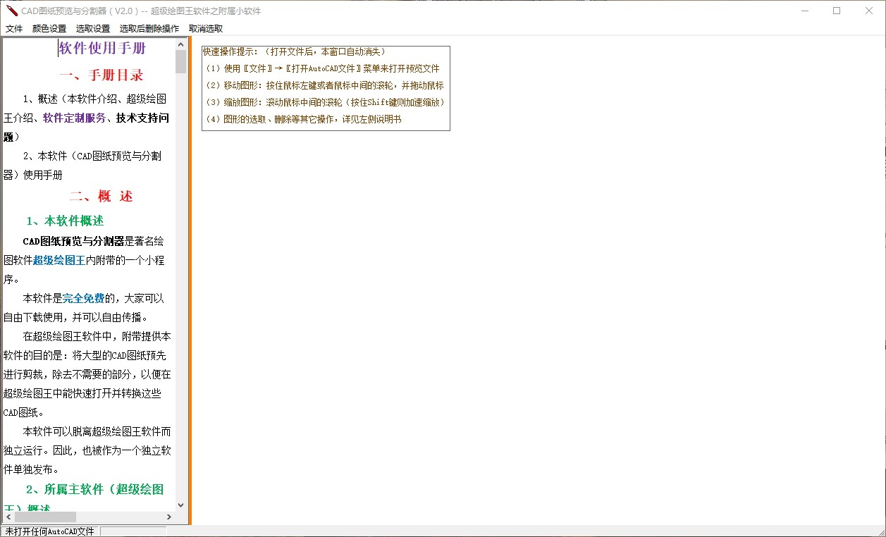 画面的左侧是说明书的显示区,右侧是AutoCAD图纸的预览区。用鼠标拖动二个区中间的粉红色分隔线,可以调整二个区的大小。