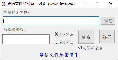 路信文件加密助手是一款强大的文件加密软件,这款软件的使用方式简单,通过简单的几个步骤就可以将各种类型的文件进行加密保护;使用这款软件加密的文件会生成一个加密文件并替换掉原文件,当用户需要访问该文件或者是对该文件进行管理操作时,用户需准确的输出密码才可以打开或者是进行复制,移动,删除等操作;路信文件加密助手提供了两种加密算法,分别是DES算法和RC4算法,这两种算法都是比较高级的加密算法,可以保证加密的文件不会被轻易和谐。