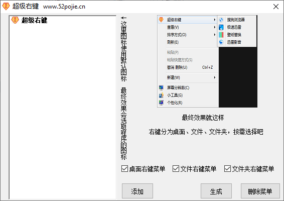 3、选择好菜单后点击“添加”按钮创建右键菜单功能。