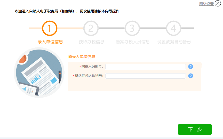 4、进入该界面后按照提示填写单位的相关纳税信息,然后点击下一步,按照向导提示填写完成后即可注册登录使用。