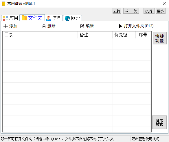 常用管家是一款网友自制的信息管理软件,用户可以使用这款软件来管理文件,网址以及个人信息;这款工具拥有很多便捷的功能,比如您可以快速复制文件路径,一键打开控制面板和系统程序;这款工具无需安装,也比较轻小,不会对计算机的运行造成任何影响;常用管家拥有灵活的文件管理功能,您可以调整文件的优先级,级别越高的文件将会显示在列表的最前方,还支持文件隐藏,将不重要的文件列表隐藏起来;需要的朋友欢迎在本站下载使用,让这款工具帮助您高效的管理各种信息。