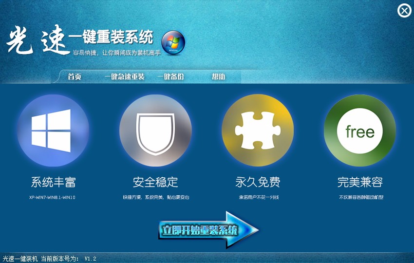 光速一键重装系统是一款非常专业且优秀的电脑系统重装软件,通过这款软件可帮助用户快速将电脑系统进行重装,软件界面简洁直观结构清晰明了使得软件操作也变得非常简单,无需光盘无需U盘就能轻松安装各种常用的系统,有的用户朋友可能不知道如何重装系统这时候就可以用到这款软件,即便您是电脑小白也能根据软件所给提示一步一步进行操作轻轻松松重装电脑系统,在重新系统前为了避免数据丢失可对系统进行备份,整个系统重装流程十分轻松,需要的话就赶快下载试试吧!