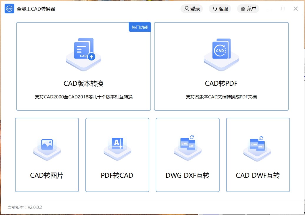 全能王CAD转换器功能强大、专业实用,是一款非常专业高效的CAD版本转换软件,使用这款软件用户可以将CAD各种版本进行相互转换,还可以将CAD文件转换为PDF,通过该软件用户可以进行PDF和CAD互转,用户只需将CAD文件或者PDF文件添加到软件上即可进行一键转换,整个操作流程非常简单便捷;全能王CAD转换器兼容DWG、DXF、DWT等图纸格式,可实现CAD各种版本的相互转换,同时可以将PDF文件转换为多种CAD图纸格式,让用户可以轻松得到满意的CAD图纸,可帮助用户轻松完成各种图纸转换工作,有需要的用户可以下载进行使用。