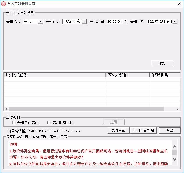 白云定时关机专家是一款非常简单且实用的定时关机软件,通过这款软件可帮助用户快速将电脑进行定时关机,具备简洁直观的操作界面旨在为用户提供最简单的操作,只需选择关机选项和关机计划并设置关机时间一键即可执行定时关机任务,即便您是新手也能在短时间内快速掌握具体的操作方法轻轻松松设置定时关机任务,有了这款软件您就可以不用守着电脑让电脑执行下载任务了,当任务完成时即可自动进行关机,使用起来非常方便,如果您需要这款软件的话那就赶快下载体验一下吧!