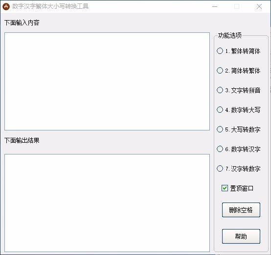 数字汉字繁体大小写转换工具是一款非常简单且实用的多功能字符转换工具,顾名思义通过这款软件可帮助用户将不用的字符进行转换包括繁体转简体、简体转繁体、文字转拼音等功能,软件界面简洁直观结构清晰明了使得软件操作也变得非常简单,只需输入需要转换的内容根据内容选择需要使用的功能即可自动显示想要得到的输出结果,输入内容和输出结果分区进行显示便于您更加直观的查看转换情况,对于内容中出现的空格可一键进行删除使用起来非常方便,欢迎有需要的用户下载体验