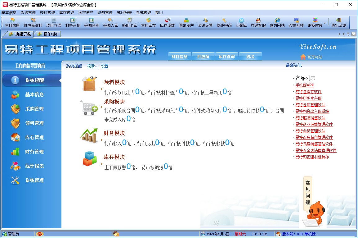 易特工程项目管理系统是一款功能强大且丰富齐全的工程项目管理软件,该软件内置基本信息、采购管理、领料管理、库存管理、固定资产、财务管理、统计报表、权限管理、打印设计、界面设计、系统设置、数据备份等多个核心功能,可以帮助用户对项目工程企业、建筑施工以及工程承包的材料库存进行有效管理;易特工程项目管理系统具有基本信息、采购、领料、库存、财务管理等数据快速统计和查询功能,可以帮助用户快速分析统计和管理工程项目数据信息,是一款非常强大专业的工程项目管理系统。