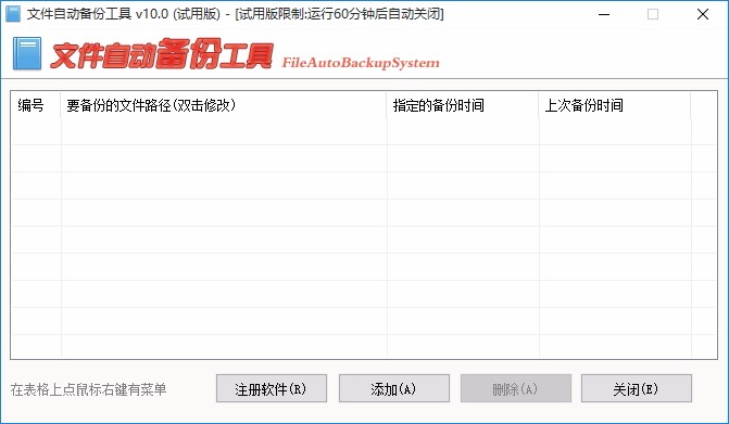 文件自动备份工具是一款非常专业且优秀的文件自动备份软件,通过这款软件可帮助用户快速将系电脑文件自动进行备份,为了防止一些误操作或系统崩溃导致文件丢失或损坏可对需要的文件先进行备份,这样一来即使操作失误或一些不可控因素发生都可有效减少一定的损失,文件自动备份工具以最简单的方式帮助您轻松自动备份文件,只需添加需要备份的文件进行简单设置,通过几个简单的步骤一键即可执行文件自动备份,使用起来非常方便,如果您需要这款软件的话就赶快下载体验一下吧!