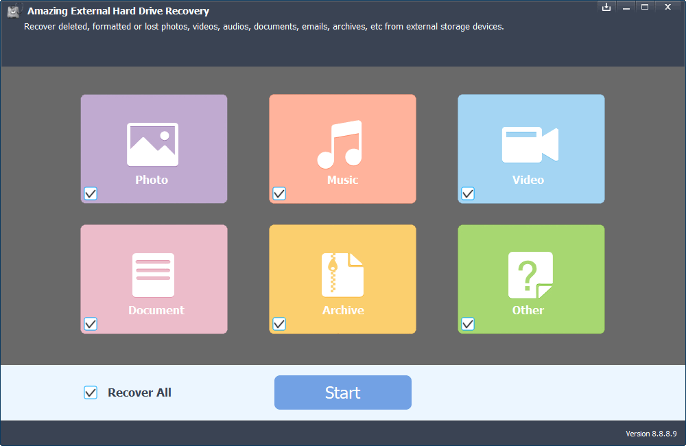 Amazing External Hard Drive Recovery是一款专业的外部磁盘恢复软件,这款软件主要用来恢复外部磁盘数据,可恢复的文件类型有图片,音频,视频和文档等等;它可以恢复因为感染病毒,突然断电,磁盘损坏等原因导致丢失的各种文件数据;Amazing External Hard Drive Recovery兼容所有主流磁盘品牌,包括常见面希捷,莱西,三星,东芝等等;这款工具易于操作,用户不必在这款软件上花费时间学习,通过软件直观的界面布局,您就可以很轻松的使用它恢复数据。