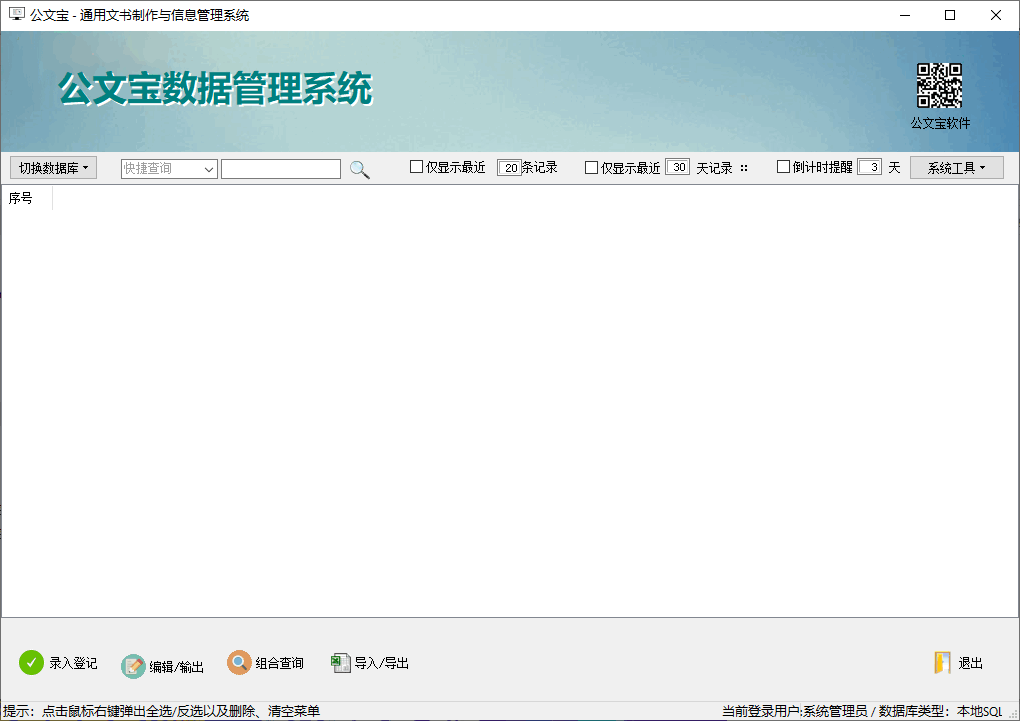 公文保文书制作与信息管理系统是一款实用的信息管理软件,用户可以通过这款软件管理各种公文,对于从事行政工作的用户来说这款工具是非常实用的;用户可以将一些常用的公文模板导入到数据库中进行管理,当用户需要使用某类公文时,就可以通过软件的检索功能快速查找需要的公文模板;找到后还可以直接打开对其进行编辑,然后再将其导出使用;公文保文书制作与信息管理系统的安装包中附带官方软件使用教程,用户在使用的过程中有任何障碍,可以打开教程查看后再使用,感兴趣的用户欢迎下载使用。