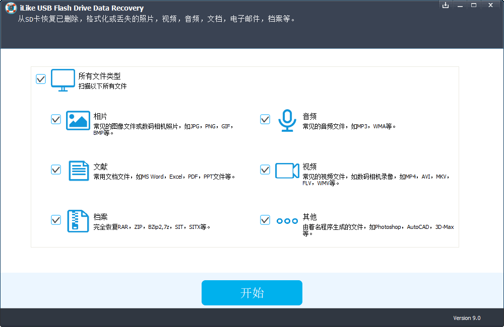 3、您根据自己需要恢复的文件类型在此进行配置,支持组合多选,选择完成后点击开始。