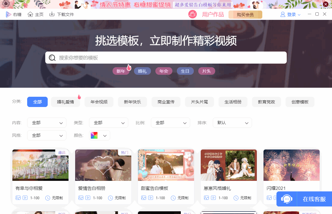右糖客户端是一款视频制作软件,还软件基于云端技术制作视频,为用户提供海量视频素材,用户可以直接选择喜欢的模板,然后将视频,图片,音频等文件添加到视频中就可以制作视频;由于合成视频是在云端完成,因此这款工具与其它视频制作软件相比要轻小很多,对计算机的要求也不是很高;右糖客户端给非专业人员提供了一个便捷的在线视频制作解决方案,让用户可以在几分钟内制作出精美的视频,拥有高清的视频输出,可以确保视频质量;这款工具易于使用,素材丰富可轻松帮助用户制作出适合各种场景使用的视频。